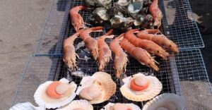 潮風を浴びながらの、ビーチでのBBQは最高ですね。キンキンに冷えたビールにサザエやホンビノス、エビといった海鮮、もう止められないですね。